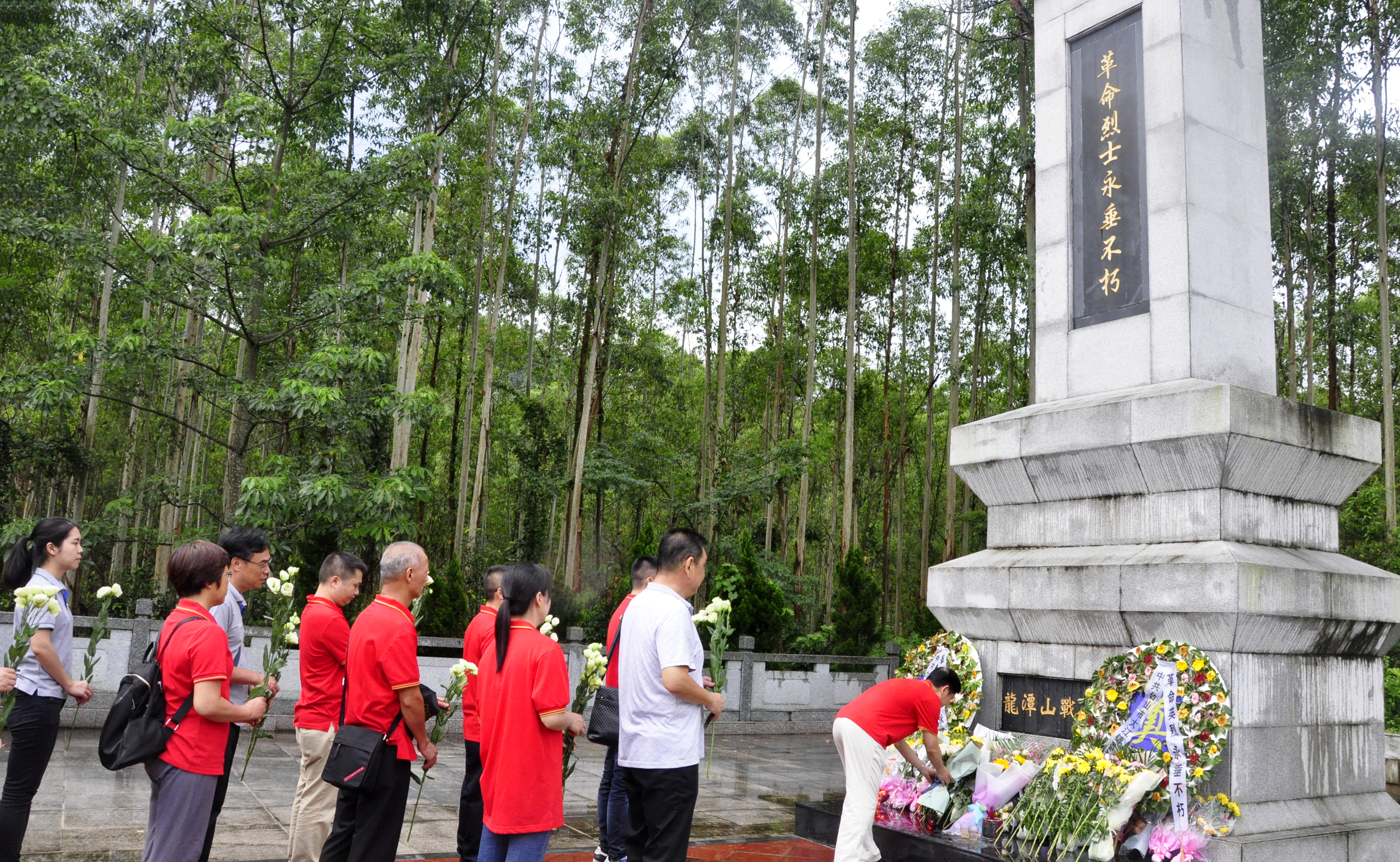 隨后,黨員們冒雨來到鶴山龍?zhí)渡礁锩沂考o念碑,向在抗戰(zhàn)中龍?zhí)渡綉?zhàn)役英勇犧牲的40多名革命烈士獻上鮮花,鞠躬祭奠,表達對革命先烈的崇敬、緬懷之情。面向烈士英靈,黨員們莊重地展開鮮艷的黨旗。