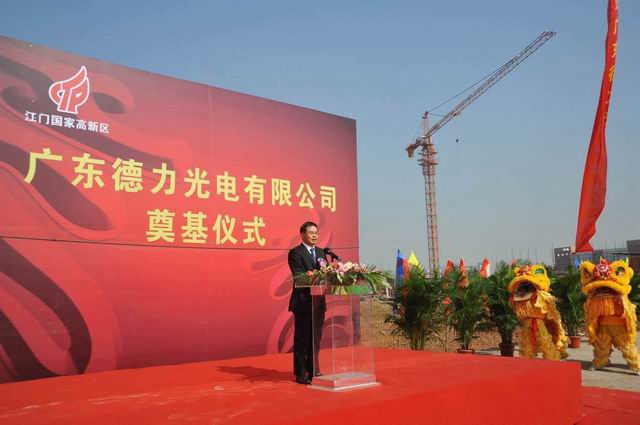 奠基儀式由高新區(qū)管委會副主任費(fèi)偉東先生主持,甘化股份董事長兼總裁麥慶華先生和江門市政協(xié)副主席譚繼祖先生分別在會上致辭。最后,在轟鳴的禮炮聲中,各位領(lǐng)導(dǎo)為廣東德力光電有限公司外延片、芯片生產(chǎn)項(xiàng)目埋下了奠基石,奠基儀式在一片祝福聲中圓滿結(jié)束。