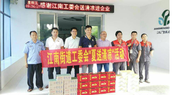2017年7月14日,江門市江南街道工委干部職工冒著高溫酷暑,深入到企業第一線,開展“夏日炎炎送清涼、人文關懷促和諧”活動,給堅守崗位的生產一線員工送上了絲絲涼意。
