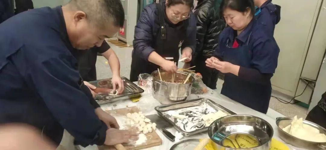 和面、拌餡、包餃子、煮餃子把活動推向了高潮,大家擼胳膊挽袖子,各顯神通,一個個象征著團圓的餃子鋪滿了桌面,在幸福歡快的背景樂下,整個場面再次熱氣騰騰。